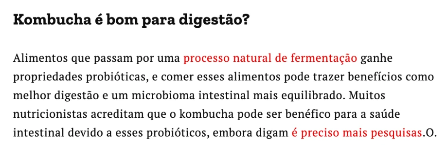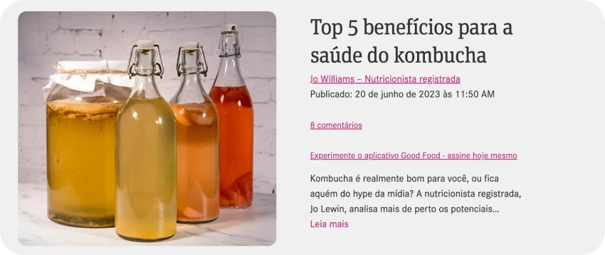 “Fontes como o BBC Good Food destacam os possíveis benefícios digestivos e antioxidantes da kombucha”